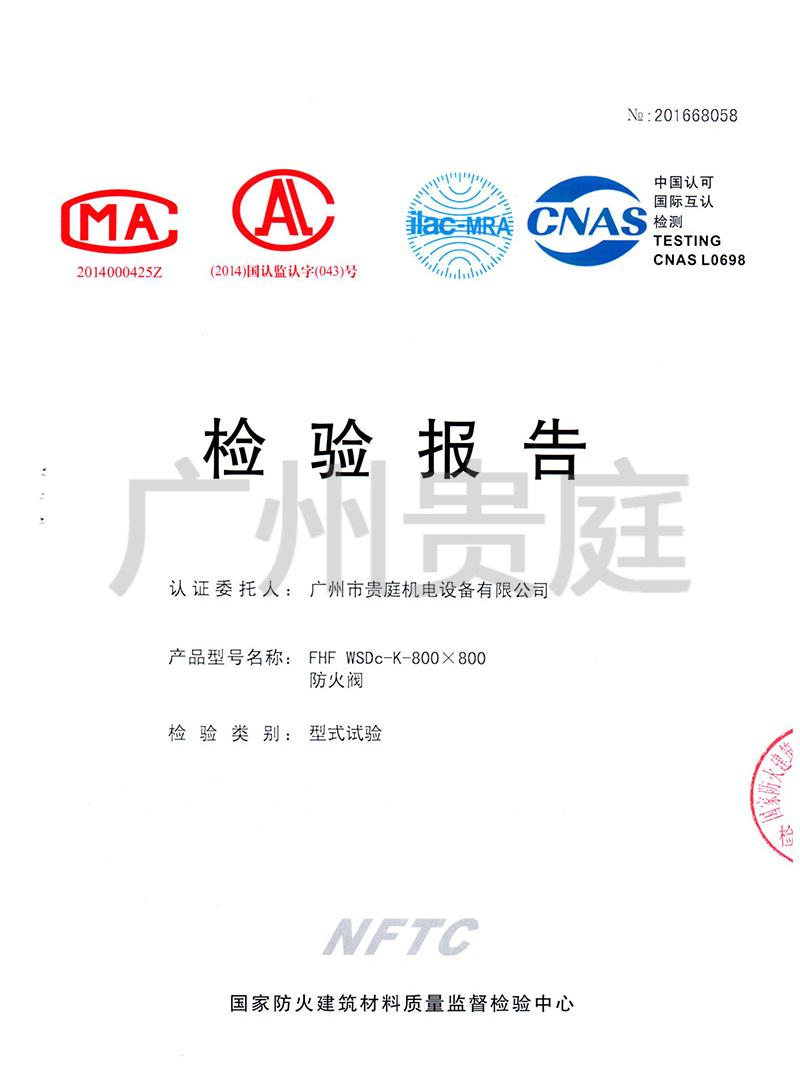 广州市贵庭机电设备有限公司生产的防火阀FHF WSDc-K-800*800顺利通过国家检测中心检测,质量稳定可靠